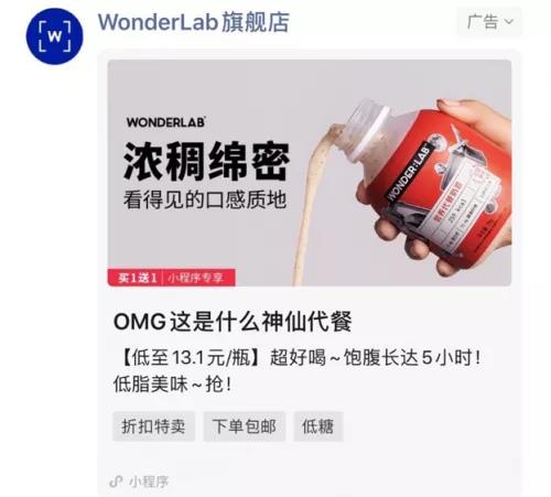 其次,便是在解决消费者痛点的基础上,学会用产品说话。2019年4月,WonderLab推出明星单品小胖瓶代餐奶昔,通过开创奶茶口感,迅速成为席卷全网的爆款产品。和市面上其他代餐奶昔不同,这款产品采用小瓶包装,更符合消费者便捷化携带的需求;同时,还提高蛋白质比例,添加可以嚼的颗粒,让“代餐”更实在。颜值+口感双重加持下的小胖瓶,让WonderLab成立第一年的销售额便突破了6000万。