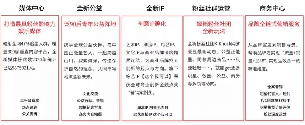 • 商务中心:全新娱乐希望打造全新的“偶像娱乐营销“模式,为品牌提供专业的偶像营销和执行方案;在服务模式上,提出包含宣发、导流、销售的一站式全链条服务,并将销售变现前置,倒推产品设计、创意、传播等环节,帮助品牌方实现品销合一。