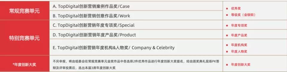 为了拓展TopDigital创新奖的覆盖范围,增加奖项的普及性及客观性,2021TopDigital创新营销奖同去年相比,推出了全新的竞赛单元,覆盖5个奖项类别及最终年度创新大奖。