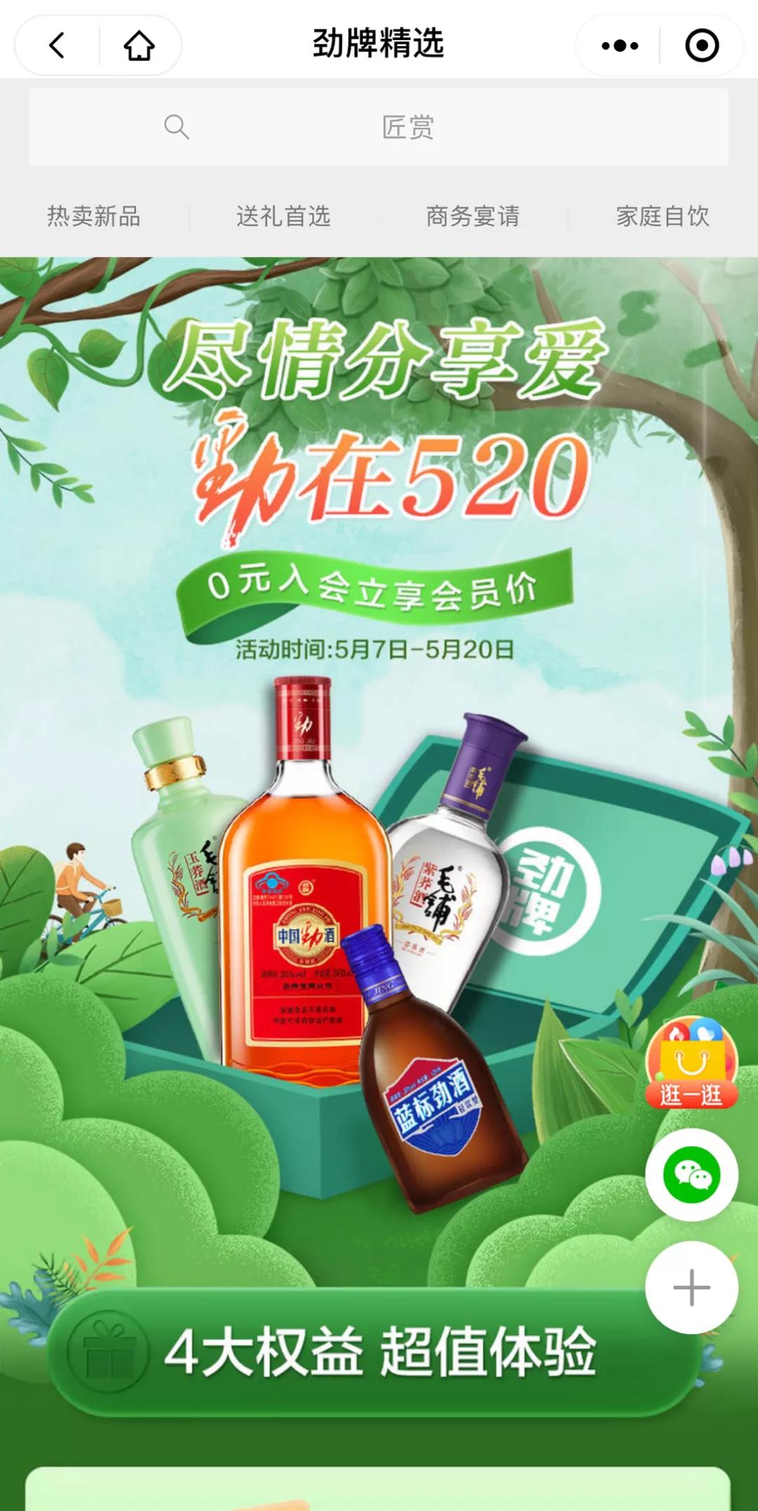 劲粉节的活动引流上也处处透露出“小心思”,多线电商布局击穿线上线下渠道,为劲酒带来电商销售转化。小程序“劲牌精选”设有520劲粉节专属界面,开启活动优惠;微信公众号发放现金红包刺激消费,并设置520专栏引导下单;520ml装中国劲酒,既包含着“我爱你”的美好寓意,更大的产品容量也意味着更多的“分享”属性。