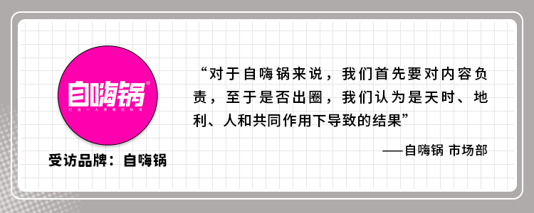 自嗨锅:自嗨锅上半年的业务重心在新品牌孵化上,营销费用并没有占很高比例,但其实上在长期布局的板块上,品牌有在持续投入。一部分是影视剧的植入,基本保持一月一剧的频次;另一部分主要集中在微博、微信、抖音等社交媒体平台的内容种草以及重大时间节点的内容传播。自嗨锅今年在营销板块的投入主要在内容部分,给消费者更真实的体验,更多是增加消费者对品牌的好感度。