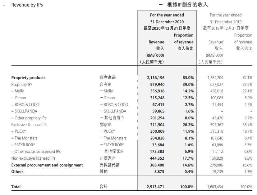2020年,泡泡玛特原创IP和独家IP的收入占比约67%。其中,