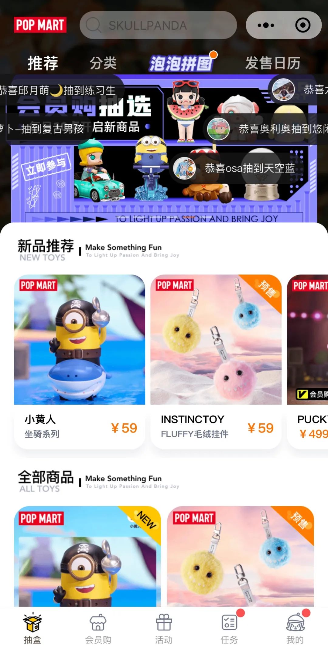 此外,除去常见的天猫、京东等主流电商平台布局,泡泡玛特依托微信生态搭建起小程序抽盒机,通过一系列拉新促活动作,积累大批量优质会员。