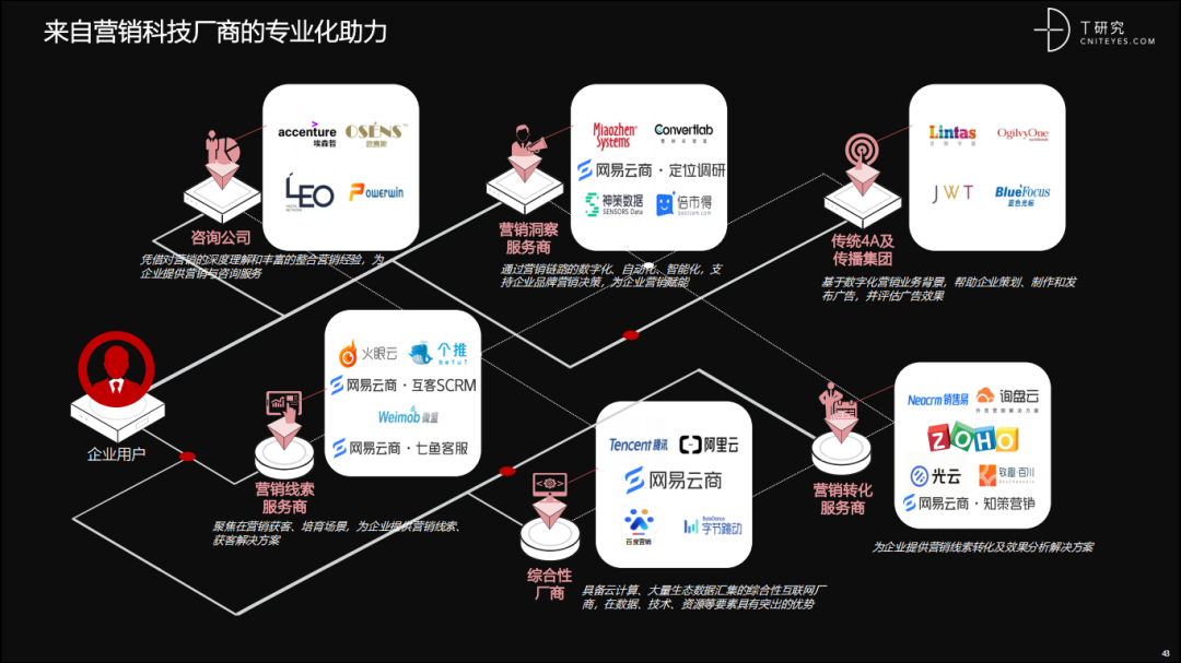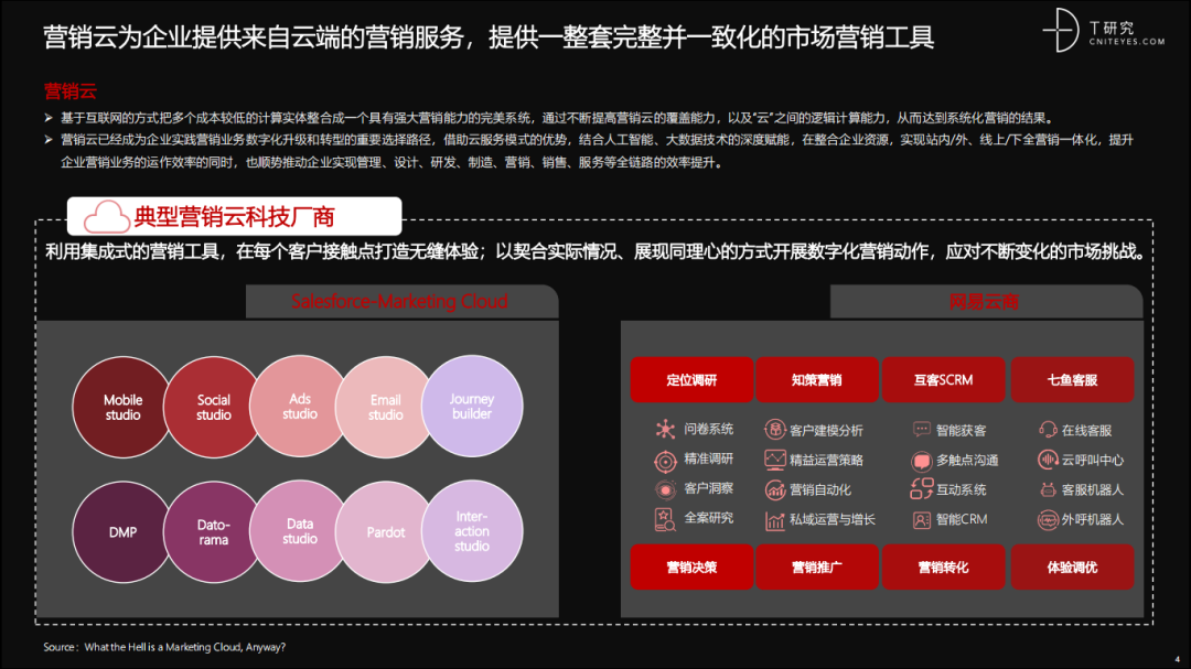 相较于国外较为成熟的 MarTech 市场,国内整体还处于发展初期,但也呈现出如火如荼的发展势头。近日,在人称 T 客旗下 To B 产业研究品牌“T研究”发布的报告《2021 营销数字化的下一个站点 营销云的无声跨越:从 AdTech 到 MarTech 的逻辑转换带来的机会与趋势》(以下简称:营销云报告)中,也提及了这一点:以Salesforce、Adobe等为代表的国际厂商,在生态布局、市场能力和战略能力上,比国内厂商更胜一筹。但在服务能力上,国内的很多厂商正在迎头赶上,无论是对企业营销数字化升级的需求理解,提供的咨询方案,还是后续的项目实践,已经初步具备了与国际厂商掰手腕的能力。