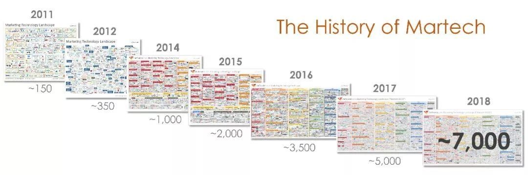 2011 年,MarTech 概念创始人 Scott Brinker 发布首版以西方市场为主的 MarTech 市场生态布局图(Martech Landscape),当时上榜的公司仅有 150 家。其后的每一年,这个数字都在不断扩大,在 2020 年已经达到 8000 家。