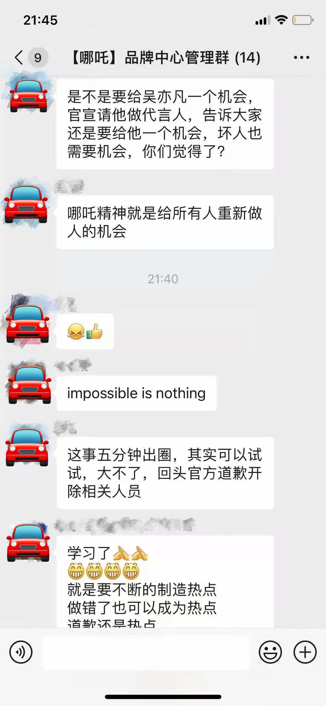 行业形式向好之下,8月3日晚,一张来自“新能源汽车圈”微信聊天截图刷爆互联网。截图内容显示,哪吒CMO在“品牌中心管理群”中发言,称愿意给吴某凡改过自新的机会,希望让他来代言哪吒汽车。同时,他还补充道,“哪吒精神就是给所有人重新做人的机会。”期间一共有三个人对于其言论表示赞同态度,在截图的最后,他还表示“这件事五分钟出圈”、“回头官方道歉开除相关员工”。