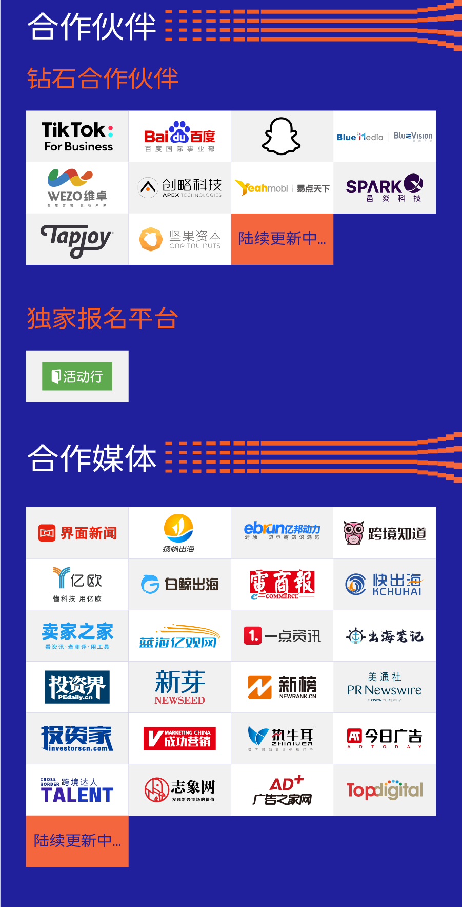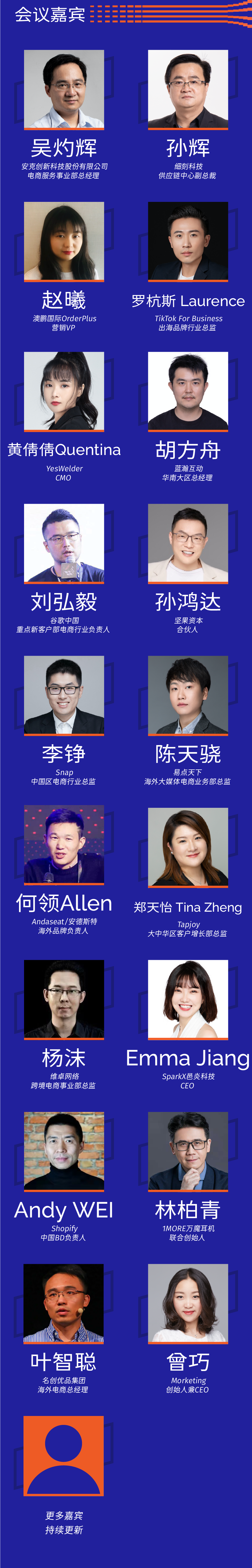 目前,大会确认了跨境出口电商营销上下游生态各类企业嘉宾代表出席活动,嘉宾包括TikTok For Business、Snap、谷歌中国、Shopify、名创优品、YesWelder等。最新嘉宾信息与议程安排如下: