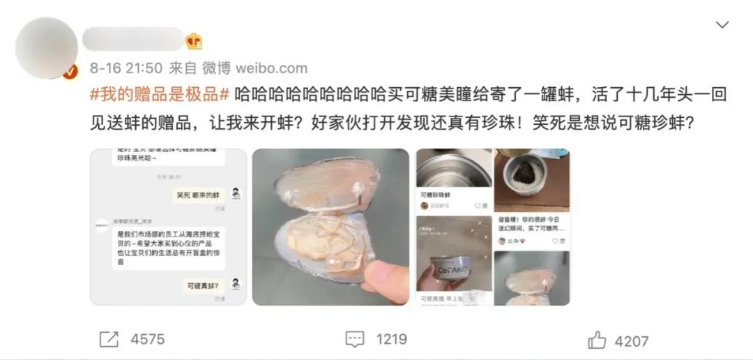 在新品上线期间,CoFANCY可糖发起“买珍珠高光新品,即送珍珠罐头”,得到不少惊喜反馈:“没想到买美瞳,竟然送真的珍珠!”许多用户乐此不疲,还将“棒/蚌”同“真蚌/真棒”谐音梗送至评论区。