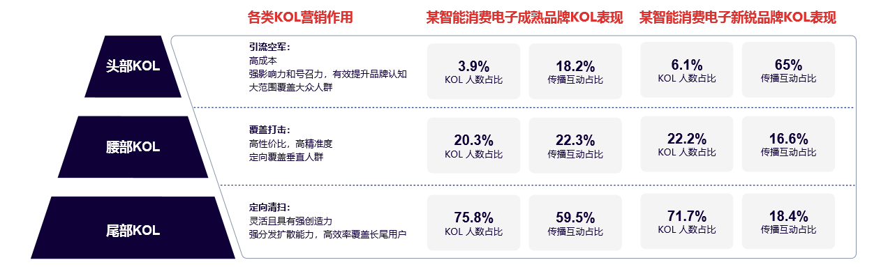 秒针提出了KOL分层分析方法论,帮助品牌主更好地意识和区分头部和腰尾部KOL的营销作用。通过「金字塔型」布局,品牌主能够层层渗透,完成消费者心智的沉淀。比如,头部KOL能够通过强大的影响力和号召力“引流空军”,这对于希望快速、有效提升消费者认知、大范围快速覆盖大众人群的品牌主而言可谓上策,但存在的缺点也同样明显,即成本较高。