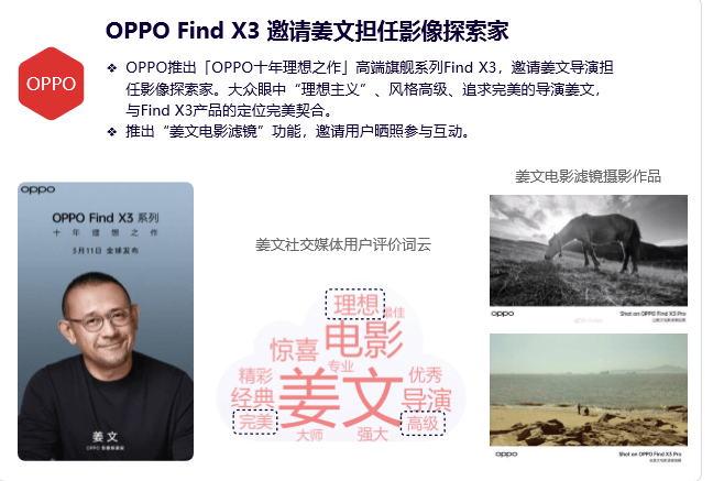 品牌开始通过不同细分领域KOL精准触达目标人群,明星营销也从“唯流量论”逐步转变为追求品牌定位与代言人特质的深度融合。比如在推出中高端机型时,被称为“10年理想之作”的OPPO Find X3推出了全新的“电影模式”,邀请集制片人、导演、剪辑、编剧多重身份于一体的姜文担任OPPO的「影像探索家」。
